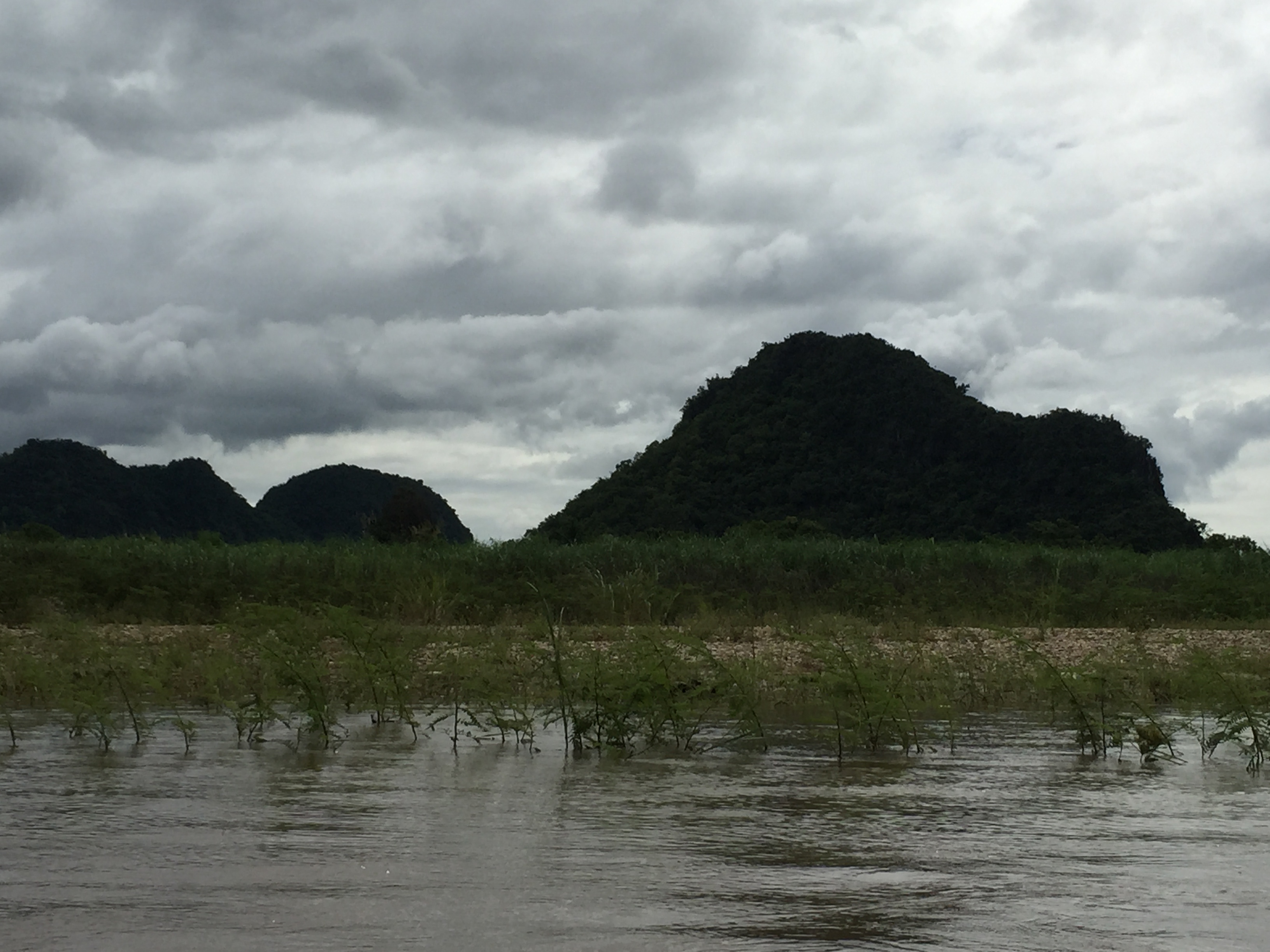One of my favorite experiences in the Chiang Rai region so far was a 2 hour boat ride on the Mae Kok River, starting from a boat pier near the center of Chiang Rai. Heading west, and traveling alone, I hired a “long tail” boat and driver from an organized business at the pier, then headed up-current for just over an hour. This was a glimpse of a side of Thailand that is not readily accessible. From the center of the river, you get a real feel for what life must have been like decades, or even centuries ago. These boats are essentially oversized canoes with a V-6 or V-8 engine on a stick (or a “long tail”) which projects the propeller 10 feet or more behind the boat. This allows the driver to push completely into shore in very shallow waters. Even up-current, we probably averaged 15-20 knots. The boat did have a tin roof over us, providing shade from the sun. The weather during this trip, and spanning about a 14 day period, was overcast without being rainy. This was quite unusual, and a blessing as the daily high temps during that period were in the low 80’s F, rather than 92-95 F or so degrees as an average. The experience was lively. Within 10 minutes of the journey, the engine quit. The driver (who apparently didn’t speak Thai either – maybe he was Burmese or Cambodian), looked unconcerned, so I was supportive of that approach. We were in a rush of current, but he simply switched over to another gas tank (explained to me by some manner of hand gestures and charades) and we were on our way. Maybe 30 minutes later, when the engine quit again, he seemed more concerned, but he got it going again in just a few minutes. Yeah!